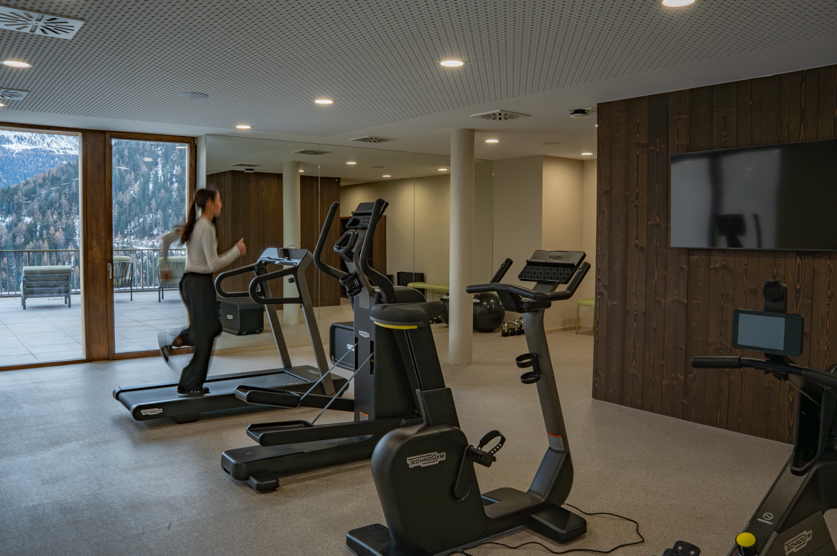 Im zweiten Stock der Ferienanlage Guernerés empfängt Sie der Fitnessraum in einem hellen Ambiente mit Panoramablick auf die Berge. Er ist mit den neuesten Geräten der Technogym®-Technologie ausgestattet und ermöglicht ein effektives Training, während man zugleich die beruhigende Ruhe der Berge genießt. Cardio, Krafttraining oder Dehnübungen – jede Trainingseinheit wird zu einem Moment der Besinnung. In der schönen Jahreszeit können Sie auf der Außenterrasse im Freien trainieren oder einen Yoga-Kurs mit Blick auf die Berggipfel besuchen. Ein Raum, der ganz auf Fitness und Energie ausgerichtet ist.